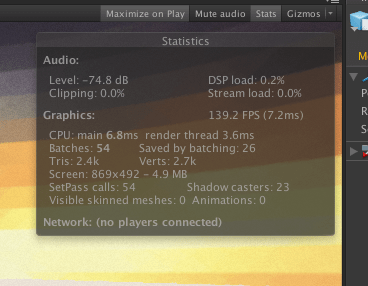 If you are not already familiar with it, you need to start using your Stats window in Unity. This is your first line of defense when it comes down to diagnosing performance issues in your game. If you open the Game view in your Unity editor you will notice a little button in the top right hand corner labeled “Stats”. This little tool will give you lots of great information about your game’s performance and what Unity is doing under the hood. Go ahead, click on it, I will wait…