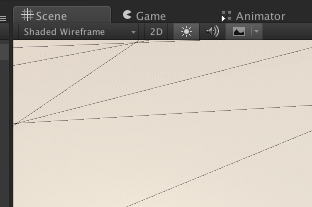 Now, We can get a bit granular and discuss Triangles and Verts. You may or may not know this, but by default (Because of OpenGL) Unity will convert all of your models to triangles. So even if you use a Quad or nGon based approach to modeling in your modeling tool, Unity will for the most part throw that information right out and force your geometry into a triangulated mode. (There are some exceptions to this, but for the most part we will assume you are not in that camp.) So for every square plane that needs to be rendered, Unity will actually render 2 triangles. You can get a sense of how Unity does this by changing your “Shading Mode” options in the Editor/Scene window to either “Wireframe” or “Shaded Wireframe”. Once you change your shading mode, you will now see what Unity is actually rendering.